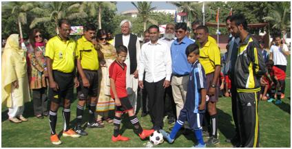 Mansoor Ahmad, Ex-Olympian of Hockey Kicking the ball of the 18th Shaheed Hakim Mohammad Said Inter-School Football Championship 2016 at Bilawal Stadium, Madinat al-Hikmah Karachi organized by Hamdard Public School. Fatema Munir Ahmad, Vice President Madinat al-Hikmah and Dr. Khalid Naseem, Administrator, H.P.S. and others are present on this occasion.