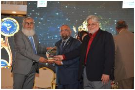 President Karachi Chamber of Commerce & Industry Junaid Esmail Makda, who was the Chief Guest of 8th International CSR Summit & Awards Ceremony, receiving shield from Founder &CEO of The Professionals Network Mehmood Tareen and CSR & CSI Activist Ateeq-ur-Rehman at the conclusion of the ceremony.