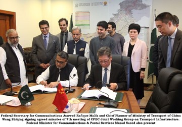 On conclusion of the 7th meeting of Joint Working Group on Transport Infrastructure between Pakistan and China, the agreed minutes were inked at Ministry of Communications in Islamabad today. From Pakistan side, Federal Secretary for Communications Mr. Jawwad Rafique Malik and from Chinese side Chief Planner of Ministry of Transport Wang Zhiqing signed the minutes.