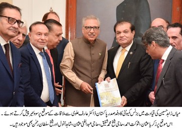The delegation included Zakaria Usman, Shaukat Ahmed, Shaukat Hussain Vohra, Saquib Fayyaz Magoon, Haji Sheikh Muhammad Shafique, Haji Abdul Ghani Usman, Shahid Anwal, Qamar Anwal, Javaid Essani, Shabbir Hassan Mansha Churra, Sheikh Sultan Rehman, Shakeel Ahmed, Aamir Shafique, Ali Zahid and others. The president said that investment-friendly environment was topmost priority as it is imperative for economic progress and prosperity. The private sector generates resources necessary for national development and improvement in the social sector, he said.