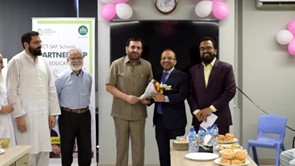 Photo Caption: Green Crescent Trust CEO Zahid Saeed presents a bouquet of flowers to President AKTI Salman Aslam. At the occasion Faizan Javed, Habib Naveed and Saad Zia are also present.