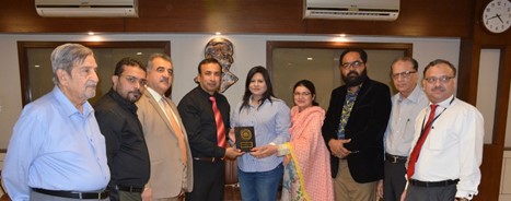 Photo Caption: President KATI Danish Khan presenting flower bouquet to Dr. Nayyer Jabeen, Regional Head of the Dr. Essa Laboratories. At the occasion Faraz-ur-Rehman, Maheen Salman, Hanif Gohar, Syed Tariq Hussain and Dr. Samiuzzaman are also present.