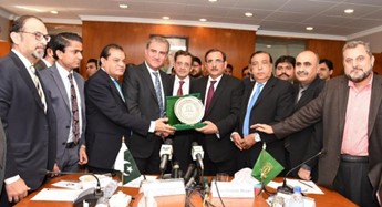 Mian Anjum Nisar, President FPCCI presenting FPCCI crest to Makhdoom Shah Mahmood Qureshi, Foreign Minister of Pakistan. Mr. Kurram Ijaz, Zubair Baweja, Vice Presidents FPCCI, Mr. Zakria Usman, Mian Zahid Hussain, Asim Ghani Usman, Shaukat Ahmed and other also seen in the picture.