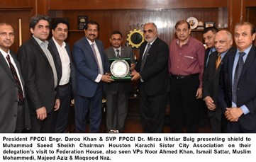 The delegation from Houston Karachi Sister City Association (HKSCA) under the leadership of Muhammad Saeed Sheikh President -HKSCA met with Engr. Daroo Khan Achakzai President FPCCI and Senior Vice President Dr. Mirza Ikhtiar Baig at Federation House. Saeed Sheikh highlighted the linkages between Karachi and Houston which were declared twin cities and emphasized the need people to people connectivity and cultural harmony for a closer understanding. Saeed Sheikh informed that the Mayor of Houston will