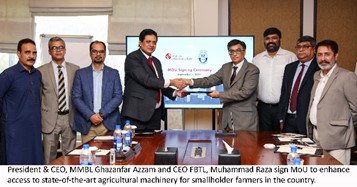 Ghazanfar Azzam, President and CEO MMBL, and CEO FBTL, Muhammad Raza signed the MoU in Islamabad in presence of senior officials from both organizations. The arrangement will further strengthen MMBL’s agri-products portfolio that caters to the various financial needs of smallholder farmers across the country.