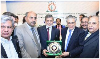 Mr. Zubair F. Tufail, President FPCCI is Presenting FPCCI Crest to Senator Muhammad Ishaq Dar, Federal Minister for Finance during his visits to FPCCI today. Mr. S.M. Muneer, CEO TDAP, Mr. Aamer Ata Bajwa, Senior Vice President FPCCI and other also seen in the picture.