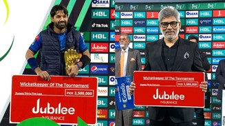 Farhan Faridi, Group Head – Retail Operations, Administration & Marketing, Jubilee Life Insurance presenting the Wicketkeeper of the Tournament award to Muhammad Rizwan, Captain of Multan Sultans after the grand finale of the HBL PSL 7 between Lahore Qalandars and Multan Sultans.
