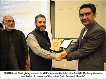 In commemoration of International Anti Corruption Day, he was addressing a seminar on “Corruption curbs economic growth” jointly held by National Highway Authority (NHA) and NAB at NHA headquarters here today. Mr. Zahir Shah also termed increasing population one of major causes of slow economic growth. To this effect, he recalled endeavours being undertaken by the NAB for termination of corruption through awareness campaigns and enforcement of relevant laws. Commending the construction work of roads and their maintenance activity by NHA, he said, heavy amounts are required for this purpose. He said, the need is to collect toll tax honestly so that maximum revenue could be collected. He said, joint efforts are needed to achieve a corruption free Pakistan.