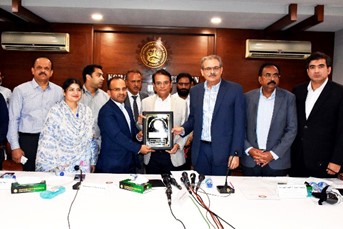 Photo caption: President KATI Salman Aslam presenting a shield to Chief Secretary Sindh Dr Sohail Rajput. Zubair Chhaya, Ikram Rajput, Maheen Salman, Farrukh Qandhari, Johar Ali Qandhari and Sheikh Umer Rehan are also present.