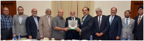 Vice Chairman Businessmen Group (BMG) and Former President Karachi Chamber Tahir Khaliq and President KCCI Shamim Ahmed Firpo presenting KCCI’s crest to President Karachi Tax Bar Association Syed Rehan Hasan Jafri, who led a delegation during its visit to KCCI.