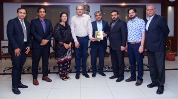 Photo Caption: KATI President Faraz-ur-Rehman presenting the shield to Sindh Solid Waste Management Board Managing Director Zubair Chana. Zubair Chhaya, Nighat Awan, Salim-uz-Zaman, Syed Farrukh Mazhar and Nasir Sheikh are also present.