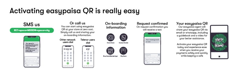 The shopkeeper further explained that there were three ways to register. He had done it by simply sending a message with the name of his city and his mobile number to 422 (type RET<space>MOBILE NUMBER and CITY and send it to 422). He mentioned that a few other retailers also registered by calling the same number or (Area code) 111-003-737 and some by visiting the Easypaisa website. After processing of the application, he received a confirmation message which was followed by the shop’s QR code being sent to him through WhatsApp. He was amazed that the process was actually so simple which saved both his time and effort.