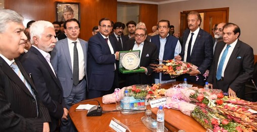 Mian Anjum Nisar, President FPCCI presenting FPCCI crest to Chairman Businessmen Group & Former President Karachi Chamber of Commerce & Industry Mr. Siraj Kassam Teli, Mr. Zakria Usman, Former President FPCCI, Mian Zahid Hussain and other also seen in the picture.