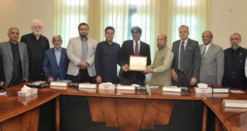 President Karachi Chamber of Commerce & Industry Mohammed Tariq Yousuf and Senior Vice President KCCI Touseef Ahmed presenting crest to Pakistan Ambassador designated to Tajikistan Muhammad Saeed Sarwar during his visit to KCCI. Vice President Haris Agar, Chairman Diplomatic Missions & Embassies Liaison Subcommittee Zia ul Arfeen, Former Senior Vice President Arshad Islam, Former Vice President Qazi Zahid Hussain, Managing Committee Members and others are also seen in the picture.