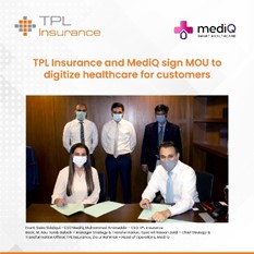 An MoU signing ceremony was held at the TPL Insurance Head Office located at SMCHS, Karachi, where TPL Insurance, Pakistan’s leading Insurtech, has entered into a strategic partnership with MediQ, Pakistan’s first virtual hospital. The partnership provides complete online healthcare solutions to TPL Insurance customers.