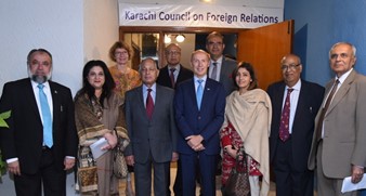Earlier, Admiral Retd. Khalid Mir delivered welcome address while Commodre Retd. Sadeed A. Malik presented introduction of KCFR. Later, the ambassador wrote his remarks on guest book and Admiral Khalid Mir presented KCFR crest to the Envoy.
