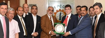 Engr. Daroo Khan Achakzai, President FPCCI presenting crest to Mr. Amjad Khan, President UK PCCI delegation at Visit to FPCCI Head Office Karachi, Dr. Mirza Ikhtiar Baig, Senior Vice President FPCCI. Mr. Arshad Jamal, Mr. Muslim Mohemdi, Vice Presidents FPCCI, Mr. Mr. Shoaib Zafar, Mr. Imran Khalil, Mr. Shakeel Ahmed Dhingra and other also seen in the picture.