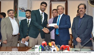 With a view to encouraging WAPDA Athletes Arshad Nadeem and Talha Talib for their brilliant performance in Javelin Throw and Weightlifting respectively in Tokyo Olympics, a prize distribution ceremony was held at WAPDA House today under the aegis of WAPDA Sports Board (WSB). WAPDA Chairman and WSB Patron-in-Chief Lt Gen Muzammil Hussain (Retd) presented cash awards worth Rs. 2.5 million each to them.